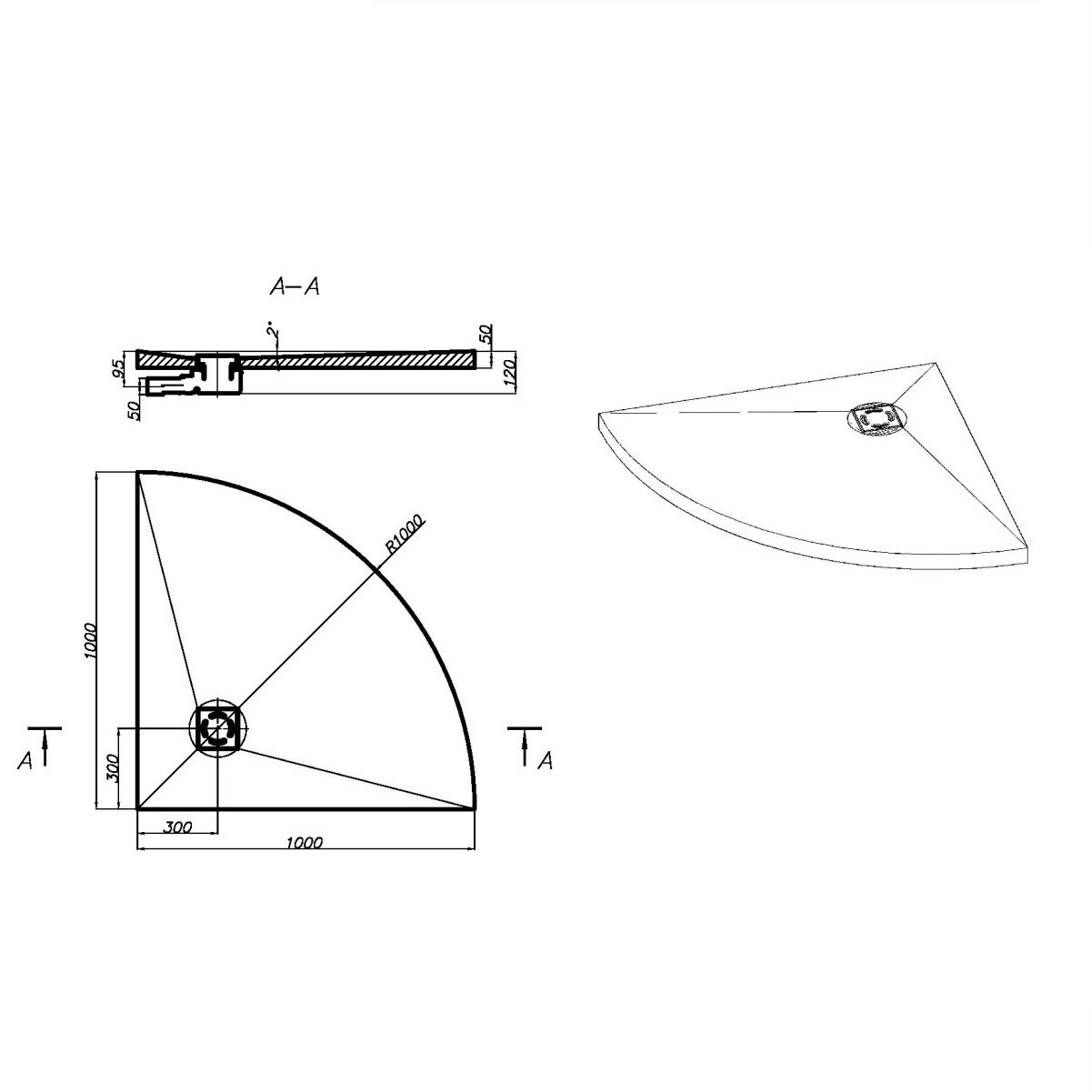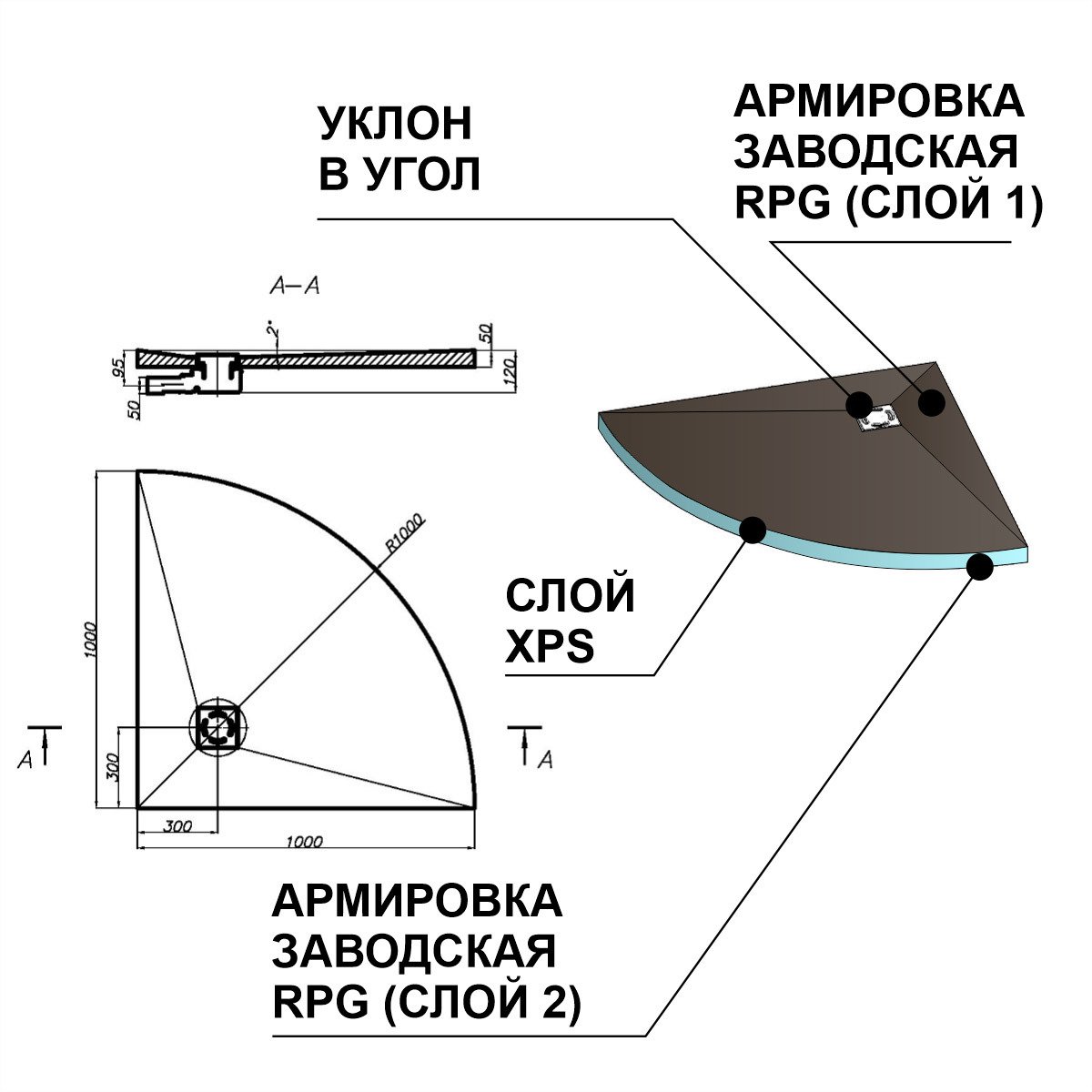 Душевой поддон полукруглый Ruspanel RPG 1000×1000×50 мм с уклоном в угол под точечный трап предназначен для создания удобной и современной душевой зоны. Монтируется на основе плиты РПГ и подходит для душевых кабин разных конфигураций, включая стандартные и нестандартные решения.