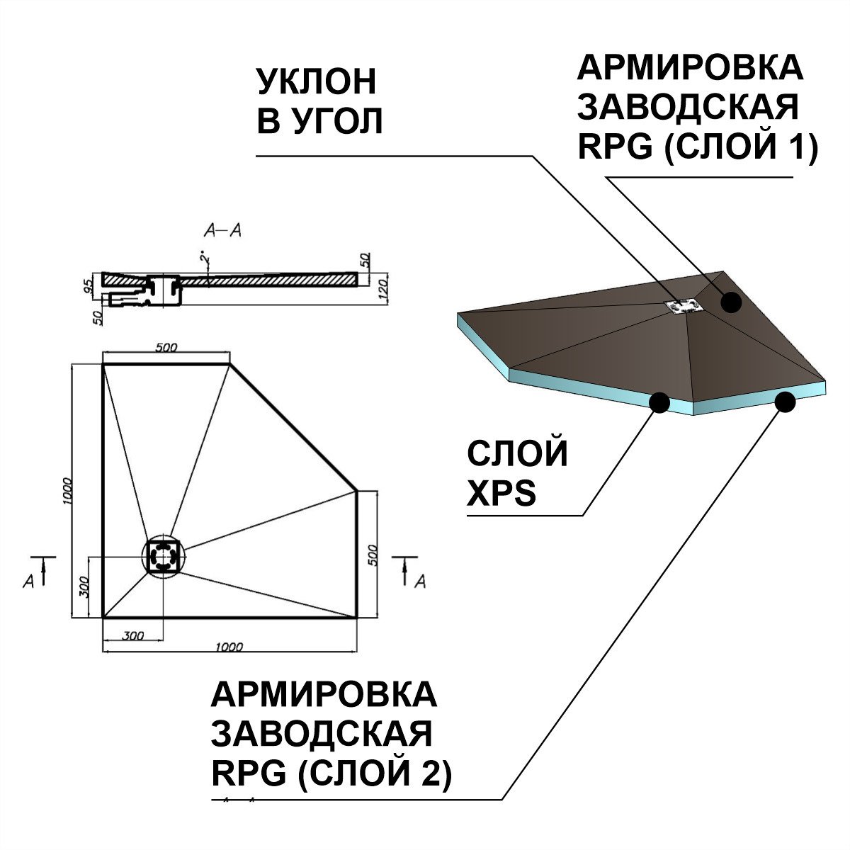 Душевой поддон скошенный RPG Ruspanel 1000×1000×50 мм с уклоном в угол под точечный трап предназначен для создания удобной и современной душевой зоны. Изделие монтируется на основе плиты РПГ и подходит для душевых кабин разных конфигураций. Включая стандартные и нестандартные решения.