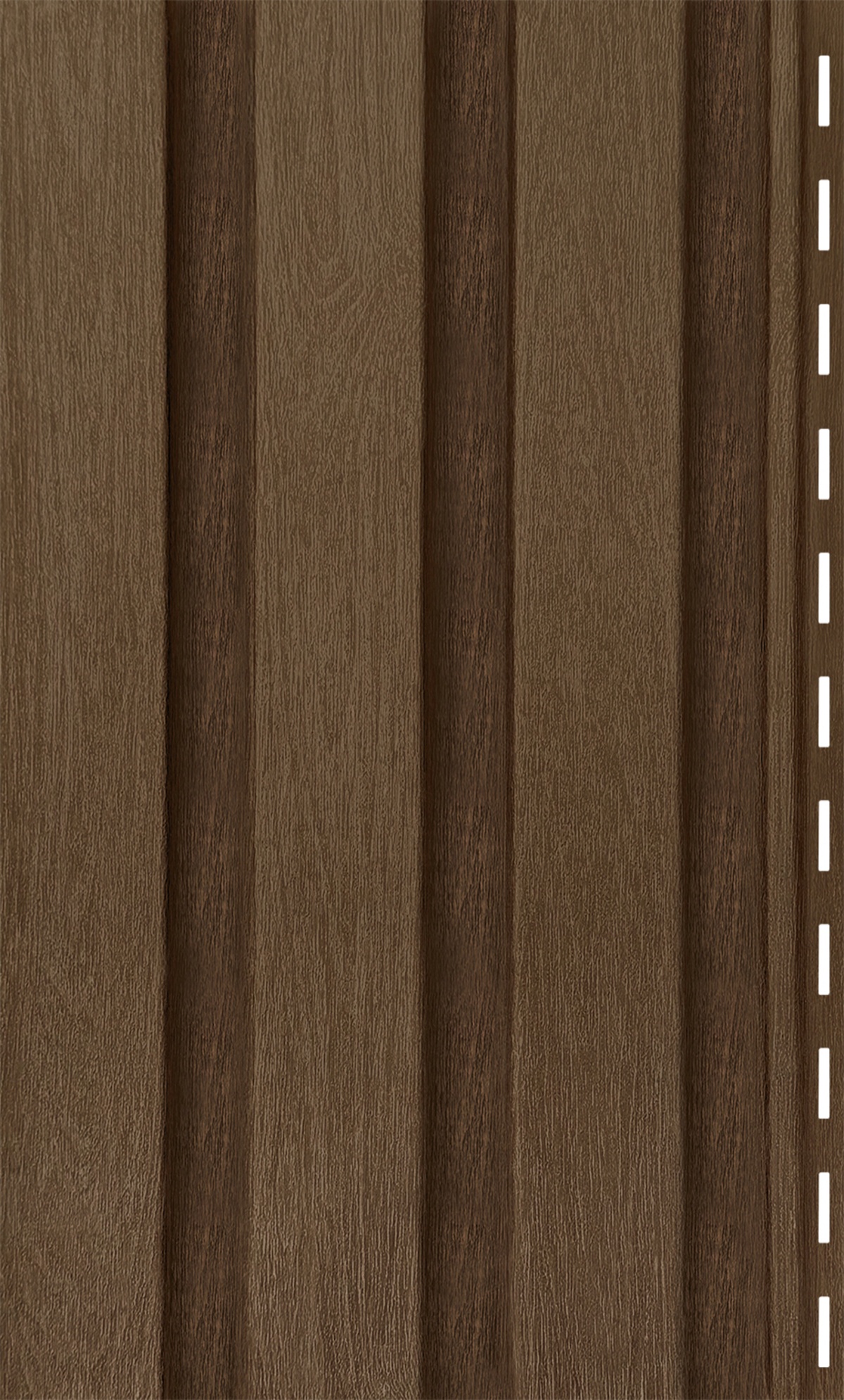 Сайдинг Timberblock Рейка фасадная — это вертикальная панель, стилизованная под три узкие деревянные рейки с чёткими гранями. Фактура точно передаёт природный рисунок дерева, а строгая геометрия придаёт фасаду выразительность и современный стиль.